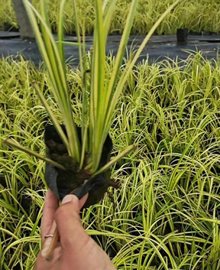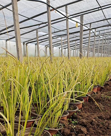 金葉石菖蒲是石菖蒲的一種,多年生常綠草本植物,株高30~40厘米,全株具香氣。硬質(zhì)的根狀莖橫走,多分枝。葉劍狀條形,兩列狀密生于短莖上,全緣,先端慚尖,有光澤,中脈不明顯。4~5月開花,花莖葉狀,扁三棱形,肉穗花序,花小而密生,花綠色,無觀賞價值。漿果肉質(zhì),倒卵圓形。